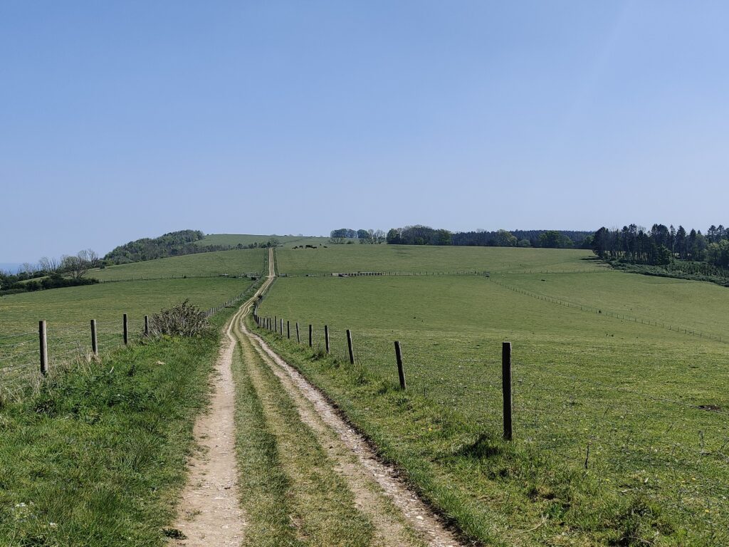 The start of this section through the Downs was wonderful though. The weather was a searing blue sky above us, the start of the driest spring in British history, or something climatic like that. Fields stretched to either side of us, separated by hedgerows and trees, floating in the wind. Classic, soft English countryside. Something you would find in a Constable painting. The soil under our feet was white and filled with large chunks of chalk. Kinda cool to walk along for sure. Unique. Genteel.