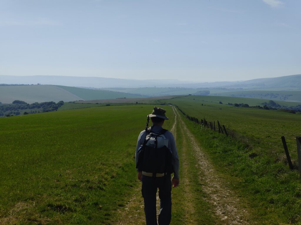 Crossing Westburton Hill, the Downs stretched off ahead of me. The morning was hazy, as it had been every morning so far, promising another baking day under a scorching sun. Shades of farm green and sky blue washed together and were hung out to dry in the rising sun. For now, I made the most of the cool morning. Dew covered grass glistened like jewels, drops of silver. Cows were to my left, and sheep far away to my right, and here I am stuck in the middle with my shadow, on this chalky white path. The trail followed the ancient fences, over and over the Downs.